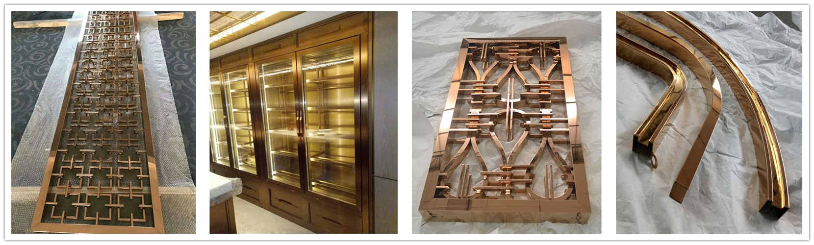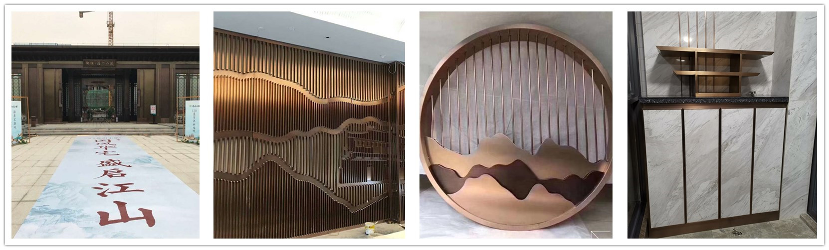 ? 公司成立于2006年,專業從事金屬制品定制,是一家集設計、生產、銷售、安裝于一體的綜合性企業。 公司產品:不銹鋼工程制品,不銹鋼屏風,鋁雕屏風,不銹鋼酒柜,不銹鋼門套,踢腳線,彩色不銹鋼裝飾板,(電鍍、鍍銅、噴砂、蝕刻、木紋、拉絲、鏡面、納米無指紋)等金屬表面處理, 剪壓刨,激光、焊接、拋光工藝設備。 產品廣泛用于,售樓部、酒店大堂、客房、KTV酒吧、會所、寫字樓、商場、等高檔場所裝飾,歡迎廣大客戶來圖定做!